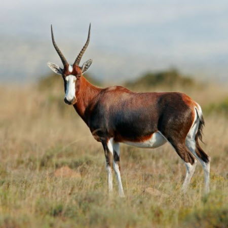 Der Buntbock ist eine mittelgroße Antilope. Der Widerrist ragt wie üblich bei Antilopen des Offenlandes weit über die Kruppe hinaus. Das Fell hat eine kräftig dunkelbraune Farbgebung mit einem Purpurglanz an den Seiten, den Wangen und den oberen Gliedmaßenabschnitten. Dazu kontrastiert die weiße Bauchseite, der Spiegel, die unteren Glieder und das Hinterteil, beim Blessbock zieht die weiße Bauchfärbung meist nicht bis über den Schwanz hoch.