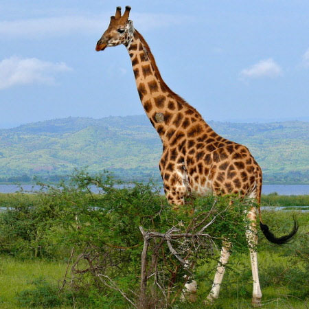 Despite its long neck and legs, the giraffe's body is relatively short. Located at both sides of the head, the giraffe's large, bulging eyes give it good all-round vision from its great height