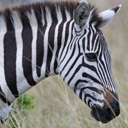Like all zebras, they are boldly striped in black and white, and no two individuals look exactly alike. Compared to other species, the plains zebra has broader stripes. The stripes are vertical on the fore part of the body, and tend towards the horizontal on the hindquarters.