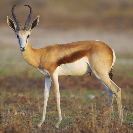 The springbok is a slender antelope with long legs and neck. Dark stripes extend across the white face, from the corner of the eyes to the mouth. A dark patch marks the forehead. In juveniles, the stripes and the patch are light brown. The ears, narrow and pointed, measure 15–19 cm (5.9–7.5 in). Typically light brown, the springbok has a dark reddish-brown band running horizontally from the upper foreleg to the edge of the buttocks, separating the dark back from the white underbelly. The tail (except the terminal black tuft), buttocks, the insides of the legs and the rump are all white. Two other varieties – pure black and pure white forms – are artificially selected in some South African ranches. Though born with a deep black sheen, adult black springbok are two shades of chocolate-brown and develop a white marking on the face as they mature. White springbok, as the name suggests, are predominantly white with a light tan stripe on the flanks.
