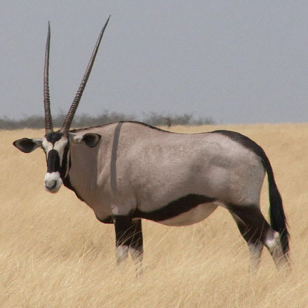 Gemsbok are light brownish-grey to tan in colour, with lighter patches toward the bottom rear of the rump. Their tails are long and black in colour. A blackish stripe extends from the chin down the lower edge of the neck, through the juncture of the shoulder and leg along the lower flank of each side to the blackish section of the rear leg. They have muscular necks and shoulders, and their legs have white 'socks' with a black patch on the front of both the front legs, and both genders have long, straight horns.