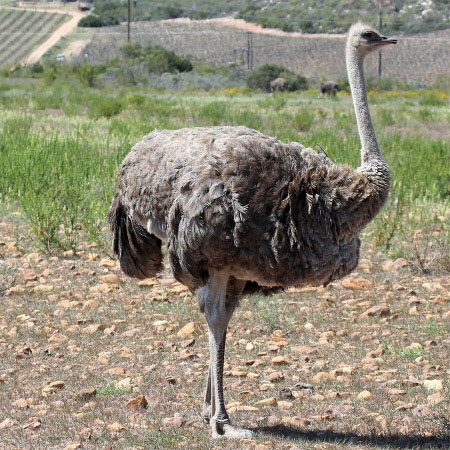 The feathers of adult males are mostly black, with white primaries and a white tail. However, the tail of one subspecies is buff. Females and young males are greyish-brown and white. The head and neck of both male and female ostriches is nearly bare, with a thin layer of down. The skin of the female's neck and thighs is pinkish grey, while the male's is grey or pink dependent on subspecies.