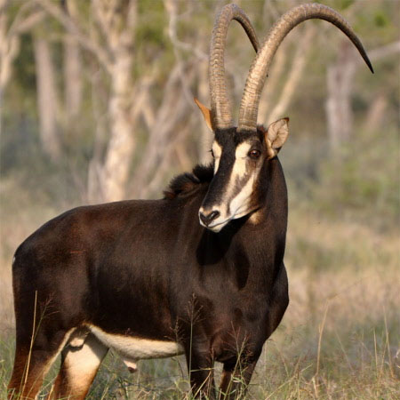 The sable antelope has a compact and robust build, characterized by a thick neck and tough skin. It has a well-developed and often upright mane on its neck, as well as a short mane on the throat. Its general colouration is rich chestnut to black. Females and juveniles are chestnut to dark brown, while males begin darkening and turn black after three years. However, in southern populations, females have a brown to black coat. Calves less than two months old are a light tan and show faint markings. The underparts, cheek, and chin are all white, creating a great contrast with the dark back and flanks. Long, white hairs are present below the eyes, and a wide, black stripe runs over the nose.